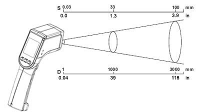 Non-contact thermometer measurements The ideal distance in most applications for the infrared non-contact thermometers is from 3.9 and 7.9 inches (100 and 200 mm); in this case, the size of the measurement spot equals approx. 0.1 to 0.3 inches (3 to 7 mm). As the distance (D) from the object increases, the spot size (S) of the area measured by the non-contact thermometer becomes larger. Make sure that the target is larger than the infrared non-contact thermometer's spot size. The infrared non-contact thermometer's two laser points are the reference for the target spot size. The smaller the target, the closer you should hold the infrared non-contact thermometer to it. When accuracy is critical, make sure the target is at least twice as large as the infrared non-contact thermometer's spot size. Inaccurate readings will result from using the infrared non-contact thermometers to measure shiny or polished metal surfaces like stainless steel or aluminum. To compensate, cover the surface to be measured with masking tape or flat black paint. Allow time for the tape to reach the same temperature as the material underneath it. Use the non-contact thermometer to measure the temperature of the tape or painted surface. When measuring a grill, for example, aim the infrared non-contact thermometer at a portion of the grill that has been blackened by the high temperatures. The non-contact thermometers cannot measure through transparent surfaces such as glass or plastic. The infrared non-contact thermometers will measure the surface temperature of the transparent surface instead. Steam, dust, smoke, etc., can prevent accurate measurement by obstructing the non-contact thermometer's optics. Hold the infrared non-contact thermometer back and at an angle to ensure the most accurate measurements. |